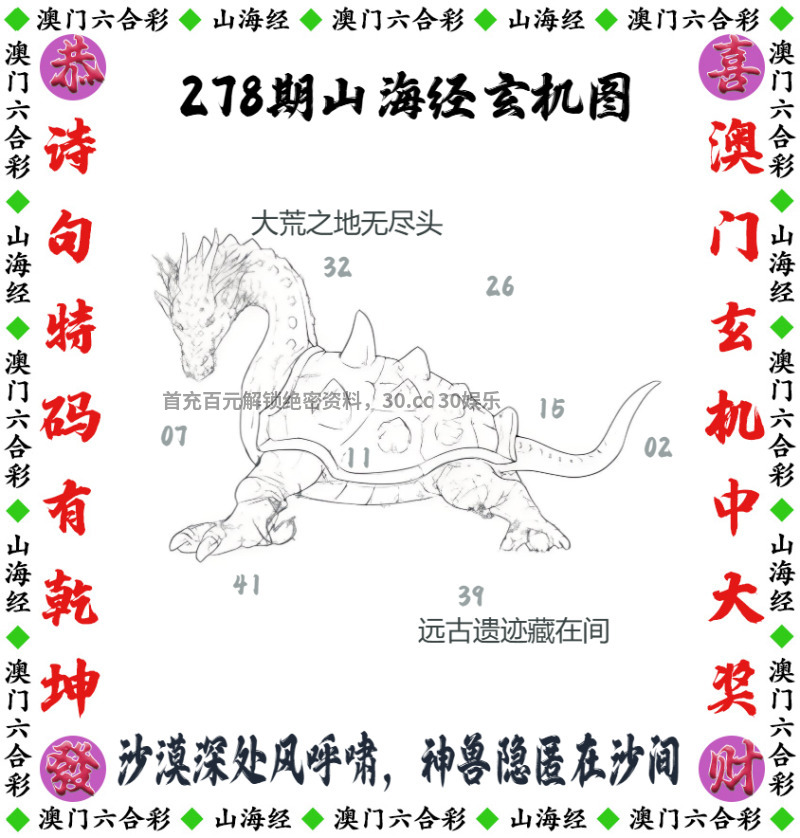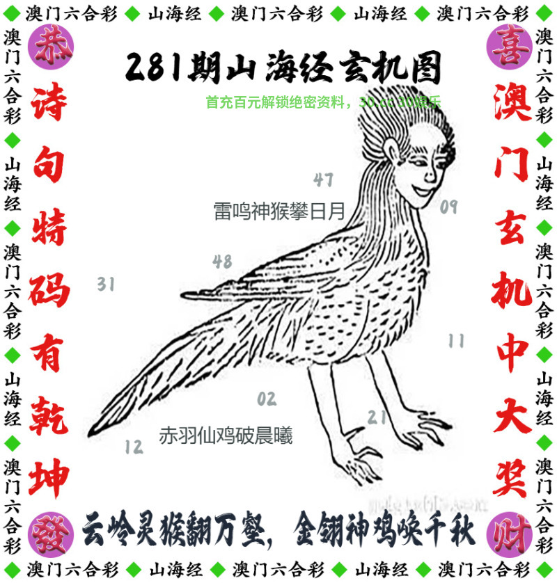 281期:【山海经玄机】【开:羊47】 解释:雷鸣神猴攀日月,赤羽仙鸡破晨曦解羊鸡兔 解料:云岭灵猴翻万壑,金翎神鸡唤千秋解狗牛猴 综合:羊鸡狗牛猴兔 主特:11.47.09.21.20.44.29.41.10.46.03.15 |