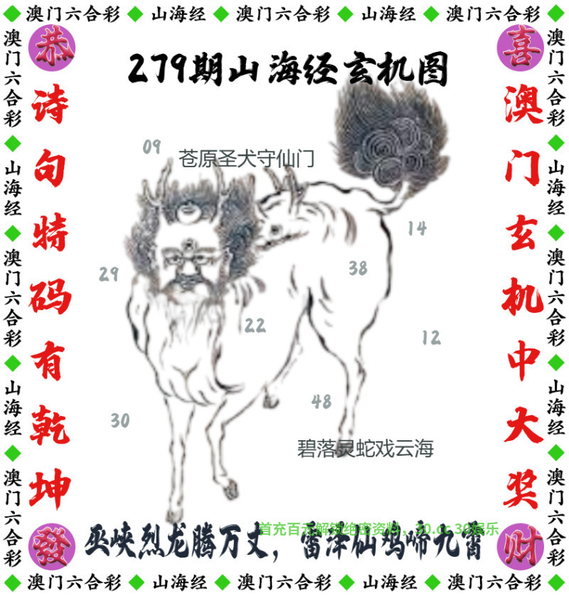 279期:【山海经玄机】【开:兔27】 解释:苍原圣犬守仙门,碧落灵蛇戏云海解龙羊狗 解料:巫峡烈龙腾万丈,雷泽仙鸡啼九霄解马鸡兔 综合:龙马鸡兔羊狗 |