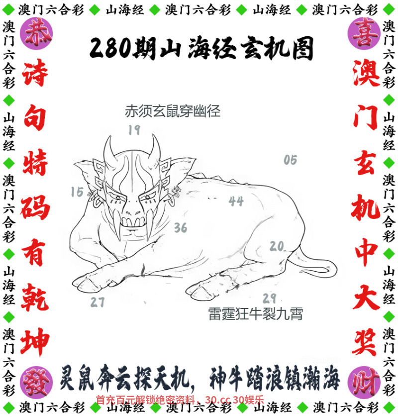 280期:【山海经玄机】【开:鼠42】 解释:赤须玄鼠穿幽径,雷霆狂牛裂九霄解牛虎鼠 解料:灵鼠奔云探天机,神牛踏浪镇瀚海解狗马羊 综合:牛狗马羊虎鼠 主特:05.29.20.44.12.24.23.47.04.16.30.42 |