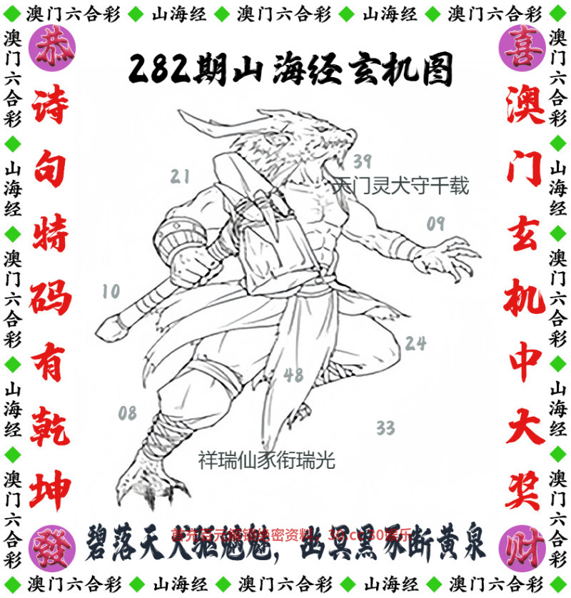 282期:【山海经玄机】【开:發00】 解释:天门灵犬守千载,祥瑞仙豕衔瑞光解马狗猪 解料:碧落天犬驱魑魅,幽冥黑豕断黄泉解鸡蛇龙 综合:马鸡蛇龙狗猪 主特:24.48.09.33.01.49.02.38.08.44.07.43 |